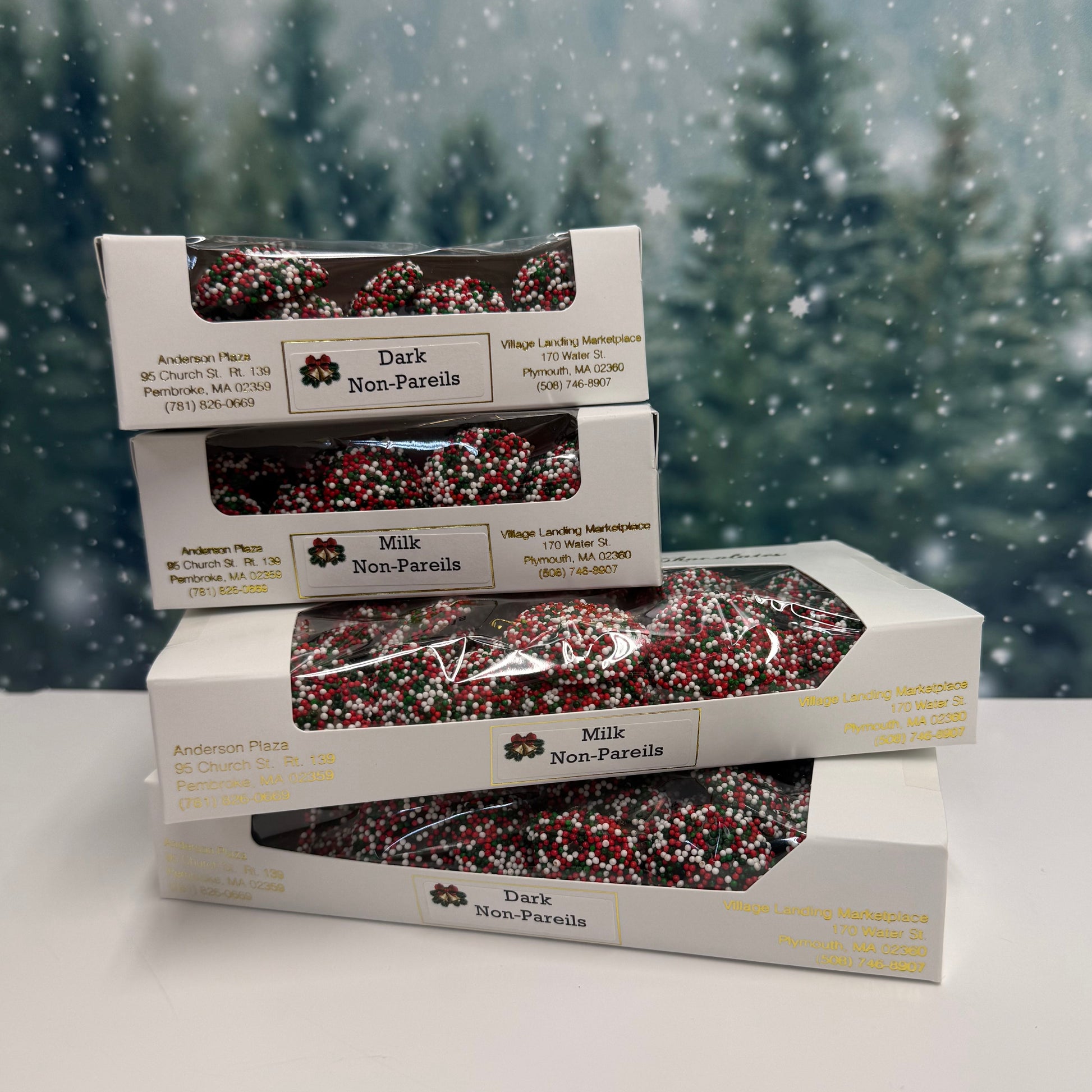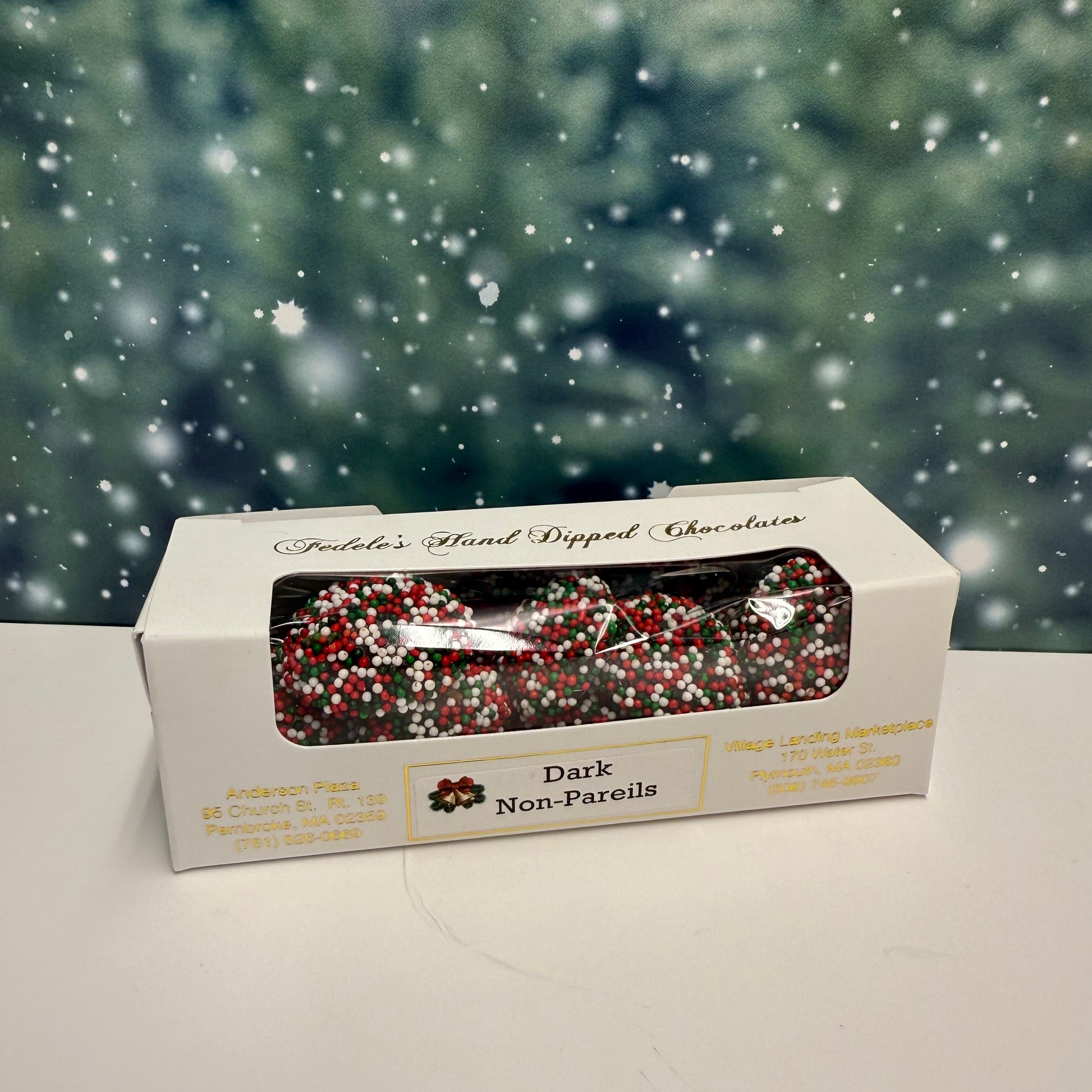 Our homemade Non Pareils in Milk or Dark chocolate with holiday colors.